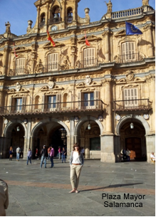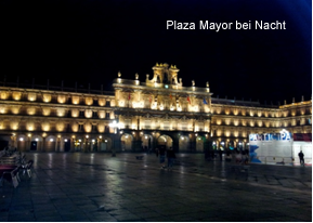 Die Plaza Mayor ist ein sehr wichtiger Treffpunkt in Salamanca. Abends sind die Bänke teilweise so voll, dass sich die meisten Menschen auch auf den Boden setzen. Dort sind Restaurants, Souvenirshops, Cafés und so weiter… Auf dem Bild sieht man das Rathaus.