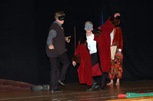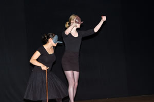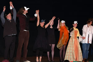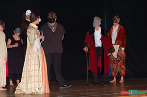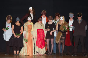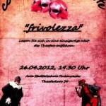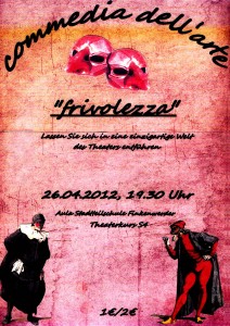 Der vierstündige Theaterkurs des 4.Semesters gab am 26. April seine Abschluss-Präsentation. In äußerst kurzweiligen 45 Minuten zeigte der Kurs ein wirklich gelungenes Stück, dass von den TeilnehmerInnen unter der Leitung von C.Vorberg komplett selbst geschrieben und inszeniert wurde. Dabei bestach die Gruppe durch ein körperbetontes Spiel, das Handlungsgerüst orientierte sich an der historischen Commedia-Tradition und damit an einer Theaterform, die in der Mitte des 17.Jahrhunderts in Italien entstand. Der Titel des Stück gab bereits einen Hinweis auf den Inhalt, denn die Handlung war – gemäß den historischen Vorgaben – durchaus leicht schlüpfrigen Inhaltes. Gelungen war dabei auch die Mischung aus modernen und historischen Kostümen, wobei die Gruppe freundlicherweise auf den Kostümfundus des Ernst-Deutsch-Theaters zurückgreifen durfte. Nach dem letztjährigen Stück “Ich brauche dich mehr, als ich dich liebe und ich liebe dich so, so sehr” war das diesjährige Stück “frivolezza” wieder ein großer Wurf. Schade eigentlich, dass die SchülerInnen ihre Schulzeit in Kürze hinter sich gebracht haben werden – in der Gruppe steckt noch jede Menge Potential.