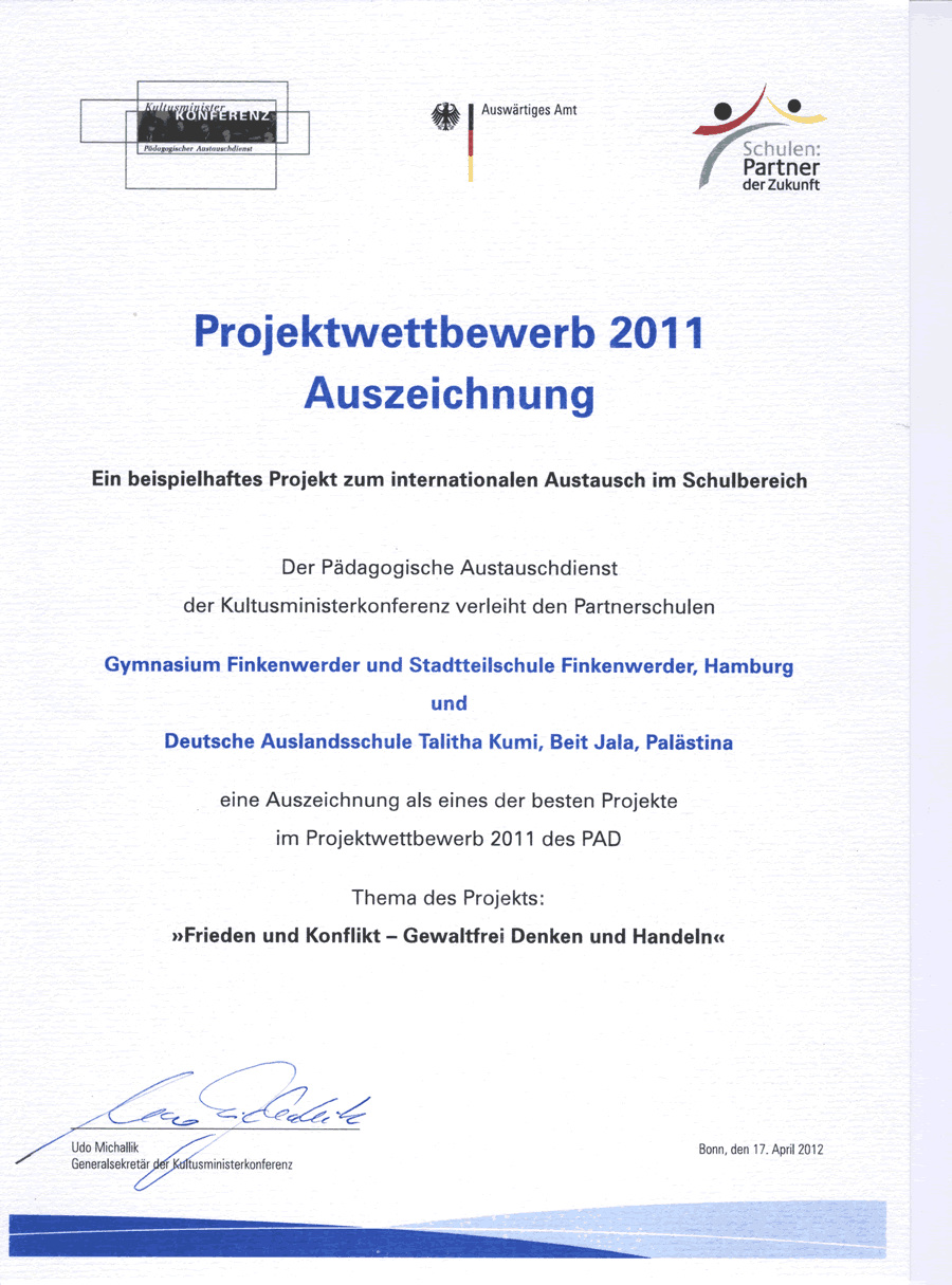 Für ihre Aktivitäten im Rahmen des Schüleraustauschs mit der Schule Talita Kuhmi in Beit Jala (Palästina) wurden das Gymnasium Finkenwerder und die Stadtteilschule vom Kultusministerium ausgezeichnet.