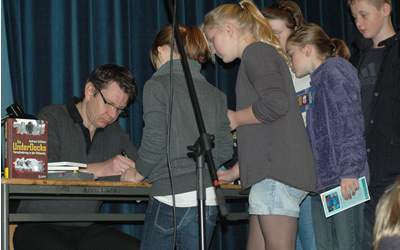 Der erfolgreiche Autor Andreas Schlüter, der in Barmbek aufwuchs und heute seine Bücher in Hamburg und Mallorca schreibt, las am 2. November den Sechst- und Siebtklässlern aus seinem neuen Roman „Die UnderDocks: Verschwörung in der HafenCity“ vor.