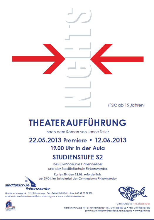 Der 4-stündige S2-Kurs aus GymFi- und Stadtteilschülern hat dabei die Grundidee der dänischen Autorin übernommen, sich dabei aber nur weniger Originaltexte bedient, sondern eigene Texte geschrieben und auch individuelle Figuren erschaffen. In dem Stück geht es um die Bedeutung des Lebens und zeigt, welche Auswirkungen negative Dynamik innerhalb einer Gruppe haben kann.