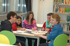 In der Schulbibliothek übten die in verschiedene Gruppen aufgeteilten Schülerinnen und Schüler zusätzlich, wie man Rechercheaufgaben auch ohne die Hinzuziehung des Internets erfolgreich lösen kann. Mithilfe eines Lageplans und dem Regalleitsystem der Schulbibliothek lernten sie, sich im Buchbestand zu orientieren. Mit Hilfe von Inhaltsverzeichnissen und Registern recherchierten sie die Antworten zu unterschiedlichen Fragen wie z.B. die historische Einordnung des Trojanischen Krieges, die Namen dreier Kathedralen, die Lebensdaten der Komponisten Vivaldi und Händel oder die Titel zweier Romane der Autorin Cornelia Funke. Am Ende präsentierten die Bibliotheksexperten der einzelnen Gruppen ihre Rechercheergebnisse.