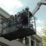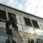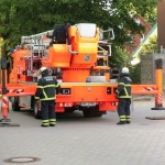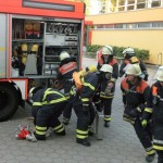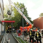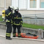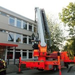 Allerdings ging es dabei nur um eine Übung, bei der das Zusammenspiel von Feuerwehren und Schule wieder einmal geprobt werden sollte. Der Großteil der 10a hatte sich dafür als Statisten bereitgestellt und wurde aus dem zweiten Stock des Hauptgebäudes befreit. Ein Teil wurde mittels Teleskopkran heruntergeholt, andere kletterten eine fast 10m hohe Leiter mit Hilfe eines Feuerwehrmannes aus dem Phänomentaraum hinunter. Mutige 10a!