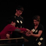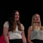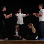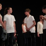 Zum Schluss spielten die Neulinge der Theaterkurse (Jg.8) kurze selbstgeschriebene Szenen und rundeten den Abend mit Improvisationstheater ab. Dabei spielten die Emotionen und die Haltung auf der Bühne eine große Rolle. Einigen Darstellern merkte man die Aufregung förmlich an, aber die Szenen im Laden, Flugzeug, in der Schule und der Selbsthilfegruppe wurden trotz einiger Lautstärkeprobleme gut und die höchst herausfordernde Aufgabe aus dem Nichts und den Vorgaben des Publikums Szenen zu improvisieren mutig gemeistert.