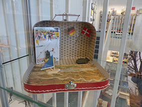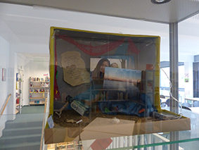 Die Klasse 8a dokumentiert in ihrem Ausstellungsbereich die Teilnahme am Trialog der Kulturen. Ihr „Heimat Finkenwerder“-Projekt zeigt die Gruppenarbeiten, die in der Auseinandersetzung mit der Herkunft, dem Verortet sein, dem Finden und auch Nachspüren der eigenen Wurzeln besonders gelungen sind. Im Koffer oder Kasten ausgestellt entdeckt der Betrachter Karten des Elblaufes, Postkarten, kleine selbsthergestellte Reiseführer (Türkei und Deutschland), Flaschenpostbriefe, Freundschafts-Fotos, Andenken an Orte und auch Verbindendes. Ergänzend zu den dreidimensionalen „Heimat-Koffern“ sind Fotos entstanden, die während des Trialogtages im März in verschiedenen Finkenwerder Geschäften und Firmen ausgestellt waren. Die Fotoporträts sind an Lieblingsorten oder typischen Lebensorten entstanden, die den Stempel „Heimat Finkenwerder“ erhielten.