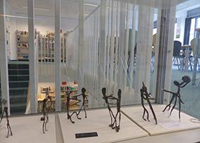 Filigrane Plastiken nach Giacometti, Tonfiguren und -köpfe stellen die S2-Oberstufenkurse aus. Alle Plastiken und Skulpturen sind im zurückliegenden ersten Semester entstanden. Figurengruppen zeigen zum Thema „Schulhofsituation“ zerbrechlich wirkende Gestalten, die sowohl Gefühle wie auch eingefrorene typische Momentaufnahmen aus dem Schulalltag verdeutlichen. Die Drahtfiguren sind mit braunem Papier kaschiert, was einen rostigen Eiseneffekt bewirkt. Wer die kleinen Figuren betrachtet, entdeckt immer wieder neue Mulden, Kurven und Bewegungen der Oberflächen, das macht die Figuren so besonders.