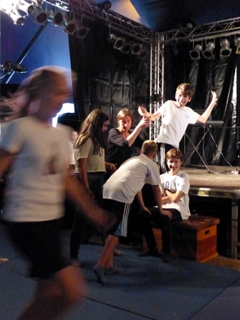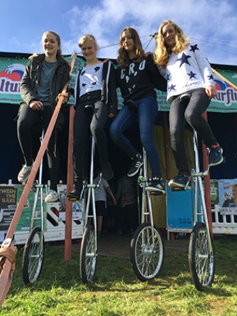 Im Zelt durfte der „Zirkus Halbstark“ des GymFi natürlich nicht fehlen. Die Fünft-bis Neuntklässler präsentierten akrobatische Einlagen: Einrad fahren in Formation, Poispiel, Balanceakte auf großen Bällen und gleichzeitiges Ringe-und-Bälle-werfen. Das darauf folgende „Improtheater“ mit schnell wechselnden szenischen Einlagen war witzig und kurzweilig. Mit Schülerinnen und Schülern aus verschiedenen Klassen haben Mona Tawussi und Annika Sell eine überraschende Welt geschaffen.