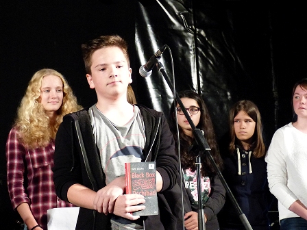 Der Auftritt begann mit Körperakrobatik der Klasse 6b. Der anschließende „Best of Bookslam“ der Klassen 9a und 9c knüpfte thematisch eng an die Trialogarbeit der Schule an. Ein erstes highlight war der Soloauftritt von Sonia aus der 9b. Ihr Song „You know I‘m no good“ von Amy Winehouse lies so manchen staunen: Ist Sonias Stimme und Ausstrahlung nicht unglaublich?