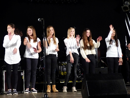 Auszüge aus dem Musical „Im Riff geht’s rund“ brachte die 7b. Dies war eine Wiederaufführung in Teilen. Mona Tawussi hatte zusammen mit ihrer Klasse extra eine Kurzfassung erarbeitet. Weiter ging es mit der Mittelstufenband des GymFi. Die Band spielt schon seit der 6. Klasse zusammen. Auch wenn zwei Mitglieder mittlerweile andere Schulen besuchen, beim Auftritt waren sie alle zusammen. Mit „All about that bass“ und „Titanium“ brachten sie „ihre“ Songs zum besten.