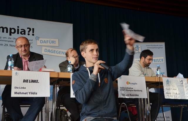 Genau dies konnten Mehmet Yildiz von der Partei „Die Linke“ sowie Florian Kasiske von der Volksinitiative STOPolympia nicht erkennen: Eine solche großevent-orientierte Stadtentwicklungspolitik gebe sehr viel Steuergeld klar zulasten von Menschen mit wenig Geld aus, verdränge weniger zahlungskräftige Mieter aus den Gebieten rund um Olympia-Stätten – und überhaupt würde hier viel Geld in Maßnahmen gesteckt, die zum Beispiel im sozialen Wohnungsbau und der Sanierung von Breitensportanlagen besser aufgehoben seien. Wie viel Hamburg letztlich zu zahlen habe, sei seriös überhaupt noch gar nicht abschätzbar.