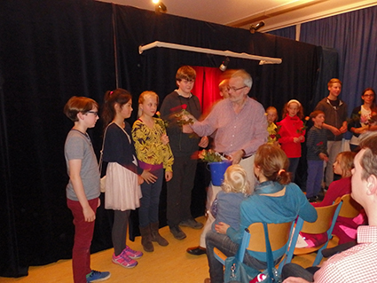 Principal Harms erläuterte im Anschluss an die Vorstellung, dass er diese dem 2014 im Alter von 80 Jahren verstorbenen ersten Stellvertretenden Schulleiter des Gymnasiums Finkenwerder, Dr. Volkmar Praechter, gewidmet habe. Dieser hatte während seiner Amtszeit an der Schule (1975 – 1996) die Compagnie nicht nur bei ihrer Gründung nachhaltig unterstützt, sondern ihr beim Bau des Klassenraumgebäudes auch den würdigen eigenen Theaterraum schaffen lassen.