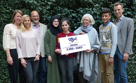 „Das ist eine große Freude und Überraschung“, meinte Micaela Sauber zu den Anwesenden, darunter Büsra, Erva und Atacan, Vertreterinnen und Vertreter des Schülerkollektivs, Ina Willen, Mitorganisatorin des Sponsored Walk, Kristina Wiskamp, Koordinatorin der Trialog Arbeit und Rüdiger Dartsch, Schulleiter.