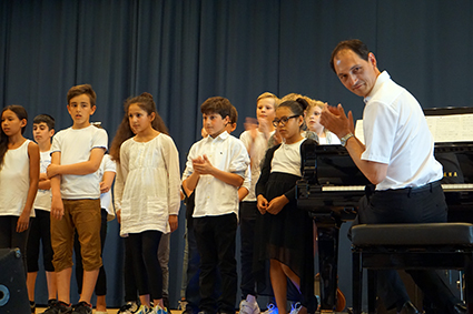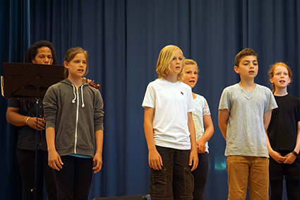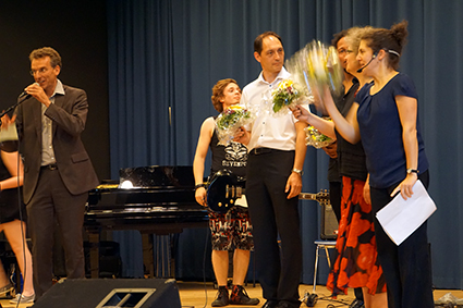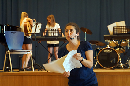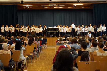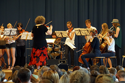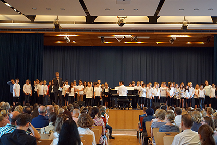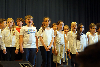 Die Klasse 6a berührte mit ihren eindrucksvollen Stimmen und einem Lied des Komponisten John Rutter die Herzen. Ebenso emotional bewegend war das vom Oberstufenchor wunderschön vorgetragene französische Lied aus dem Film „Die Kinder des Monsieur Mathieu“, mit dem speziell die französischen Austauschschüler begrüßt wurden. Die englischen Austauschschüler wurden mit ABBA willkommen geheißen. Das Orchester setzte dazu noch einen drauf, indem es unterschiedliche ABBA-Hits spielte, die das Publikum erraten musste. Außerdem schnipste die ganze Aula mit, als es das Pink-Panther-Thema spielte. Die GymFi Singers wurden dieses Mal von Sonia Ahmling Loureiro unterstützt und brachten zwei Klassiker aus Musicalfilmen auf die Bühne.