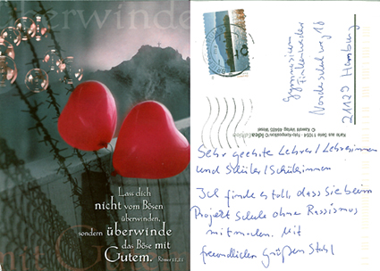 Ich unterstütze meine Schule absolut und bin froh, dieses Siegel auf meiner Schule zu haben, denn was kann ein Mensch für seine Herkunft, für seine Hautfarbe oder für das, was er/ sie ist? Die Menschen können nichts dafür! Jeder Mensch hat das Recht auf ein Leben in Frieden! Mich macht es traurig zu sehen, wenn jemand diskriminiert oder ausgelacht wird. Wie Erkan Aki, Pate des Gymnasiums in Hettstedt, bereits sagte: „Es gibt viel zu wenig Institutionen, die sich für ein respektvolles Zusammenleben der verschiedenen Kulturen einsetzen.“ Jeder kann helfen und auch wenn du denkst, dass es sowieso nichts bringt, dann sage ich dir: „Doch, es bringt etwas! Alles kommt im Leben zurück, tust du Gutes, bekommst du Gutes zurück.“ (Anna, Jg. 9)