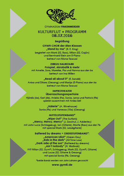 Am Freitag, den 8. Juli ab 12:30 Uhr beginnt die Vorstellung des GymFi als Beitrag zum Kulturflutfestival. Das Programm kann man hier einsehen. Im Gorch-Fock-Park findet das Open-Air-Festival statt.