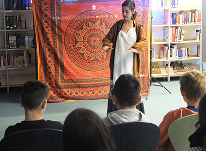 Wie in einer anderen Welt durften sich unsere Fünftklässler bei der Lesung „Die Geschichte von Scheherazade“ fühlen, die im Rahmen der Hamburger Märchentage in der Schulbibliothek stattfand. Märchen stehen jedes Jahr auf dem Lehrplan für die 5. Klasse, aber da geht es meistens um die bekannten Märchen der Gebrüder Grimm. Umso schöner, dass Roana Falkenberg ihre Zuhörer mitgenommen hat in „Tausendundeine Nacht“. Unterstützt wurde die Veranstaltung, bei der nicht vorgelesen, sondern auf beeindruckende Art und Weise nur aus dem Gedächtnis erzählt wurde, durch orientalischen Tanz. Die Kinder merkten schnell, dass man auch mit Tanz und Bewegung Geschichten erzählen kann.