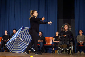 Bei dem Stück C A N D Y handelte es sich um eine Eigenproduktion. Die SchülerInnen hatten sich zu Kursbeginn für eine Lieblings-Süßigkeit entschieden und entwickelten daraus Texte, die z.B. das besondere Geschmackserlebnis, den ersten Kontakt mit der Süßigkeit, eine Kindheitserinnerung oder Ähnliches zum Inhalt hatten. Ferner entstanden ‚Battles‘, bei denen etwa die Milka-Schokolade und ein Gummibärchen darüber stritten, wer von beiden denn die leckerere Süßigkeit sei. Das Publikum wurde humoristisch über die Vor- und Nachteile von Zucker oder den Herstellungsprozess von Schokolade aufgeklärt. Sogenannte ‚Loups‘ – live eingespielt – von Genuss-Geräuschen und eine Choreographie mit Süßigkeiten-Verzehr-Soli rundeten einen süßen und durchaus etwas schrägen Abend ab.