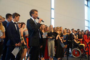 Das Programm war eine bunte Mischung aus musikalischen und Redebeiträgen. Die beiden Schulleiter haben sich erfolgreich in einer neuen Rollenverteilung ausprobiert – während Herr Dartsch die traditionelle Entlassungsrede hielt, begrüßte Herr Kirschstein die Gäste und führte launig durch das Programm.
