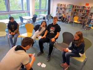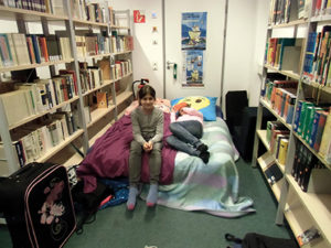 Wir, unsere Klasse 5, haben vom Ende April in der Schulbibliothek übernachtet. Wir haben uns sehr gefreut, dass unsere Paten diese Aktion mit Frau Tirpitz geplant haben. Wir haben uns am Donnerstag nach der Schule um 18:30 Uhr in der Schulbibliothek getroffen und uns erst mal gesammelt. Nachdem alle angekommen sind, sind wir in die obere Etage der Bibliothek gegangen und haben uns in einen Stuhlkreis gesetzt, um die Dienste zu besprechen, wer wann abwäscht und sauber macht. Nachdem wir das alles besprochen haben, hatten wir Zeit unsere Schlafplätze aufzubauen, die Mädchen haben unten und die Jungs oben in der Bibliothek geschlafen.