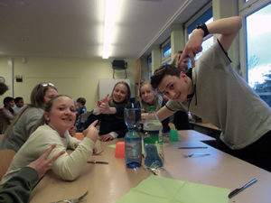 Am nächsten Morgen wurden wir mit Musik um 06:30 Uhr geweckt. Nach dem Umziehen haben wir erst mal gefrühstückt, dafür wurden Brötchen vom Bäcker geholt. Die Jungs waren dann dran mit dem Abwasch und die anderen haben ihre Schlafsachen schon aufgeräumt, gesaugt und die Bibliothek wieder besuchsfertig gemacht. Als wir fertig waren, durften wir in die Pause gehen. Im Unterricht danach waren alle schläfrig und unsere Religionslehrerin erlaubte uns, uns auszuruhen.