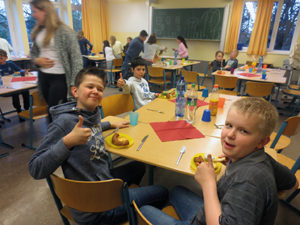 Der Klassenraum 120 war für uns noch reserviert, dort haben wir dann Abendbrot gegessen. Für das Essen hat jeder etwas mitgebracht, damit es eine große Auswahl gab, haben wir im Klassenrat vorher besprochen, wer was mitbringt. Das Abendessen war etwas chaotisch, jeder war noch ein wenig aufgeregt und konnte es noch gar nicht so richtig glauben, zudem haben wir uns nach dem Essen noch einen Streich erlaubt und haben eine Kissenschlacht veranstaltet.