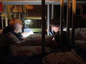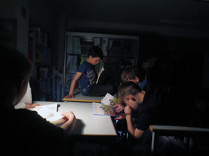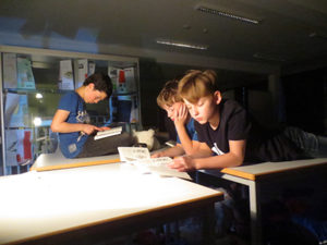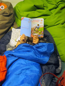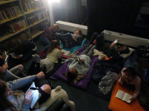 Nach der wilden Kissenschlacht und dem Essen haben sich die Mädchen und Jungs auf ihren Schlafplätzen gemütlich gemacht und wir haben dann gemeinsam in einem Buch gelesen, dass wir am Welttag des Buches geschenkt bekommen haben. Das Buch hat den Titel ,,Lenny, Melina und die Sache mit dem Skateboard“. Wir haben ca. eine Stunde im Buch gelesen und hatten den größten Teil schon geschafft, denn die Übernachtung war eine Lesenacht, somit musste man auch lesen, ob man wollte oder nicht, das spielte keine Rolle. Tom und Azim, das sind zwei unserer Paten, haben dann eine Nachtwanderung geplant, und wer mit wollte, konnte mit ihnen mitgehen, die anderen waren mit Laura und Erik in der Bibliothek und haben Spiele wie Werwolf gespielt. Die Kinder, welche auf der Nachtwanderung mit waren, sind, nachdem sie an der Ostfrieslandstraße bis zum Kreisel gegangen sind, wieder zurückgekommen. Dann haben wir gemeinsam noch Werwolf gespielt. Um 23:00 Uhr war Bettruhe angesagt, allerdings mussten wir noch im Buch soweit lesen, wie es ging.