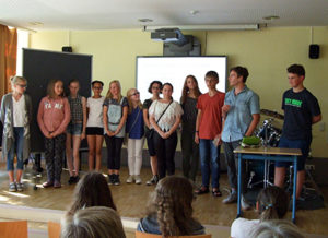 Ende Juni präsentierte der Drehtürkurs zum Thema „Licht und Schatten“. Greta und Hannah (Jg. 5) erfanden eine Kurzgeschichte. Mit ihrem Krimi „Das rettende Licht“ führten sie dem Publikum vor, wie man nicht nur durch die Geschichte an sich, sondern auch durch stilistische Mittel „Licht und Schatten“ zum Ausdruck bringen kann. Die düstere Burg „Ombre“ (franz. Schatten) als Spielort ihrer Geschichte verdeutlicht den Ansatz des Projekts.