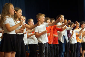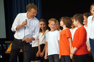 Der kernige Chor der 5. Klassen gab gleich zu Anfang allen die Botschaft mit, am besten selbst „gegen das Unrecht in der Welt“ zu kämpfen. Die Zugabe-Rufe dafür wurden mit Rockys „Eye of the tiger“ zusammen mit der Oberstufenband und einer Box-Choreographie belohnt.