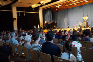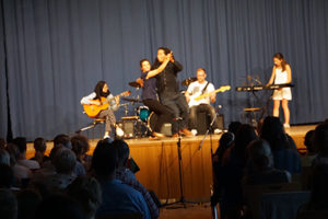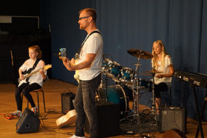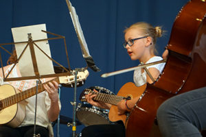 Die Band „And an apple“(Jg. 6/7) ließ es mit „Titanium“ und Nirvana ordentlich krachen, während die Oberstufenband mit einem Bossa Herrn Otufowora und Frau Tawussi über die Bühne tanzen ließ.