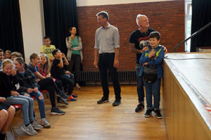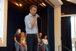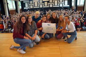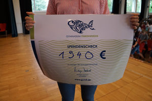 Die gesamte Schülerschaft konnte dabei sein, als der Spendenscheck für das Projekt „Tent of Nations“ überreicht wurde. Der Anteil von 1.940 Euro wird an die Begegnungsstätte von Daoud Nassar im Westjordanland weitergeleitet. Durch den Schüleraustausch des Geschichtsprofils mit Palästina wurde der Kontakt geknüpft. Das Geld ist aus dem Sponsored Triathlon des GymFi.