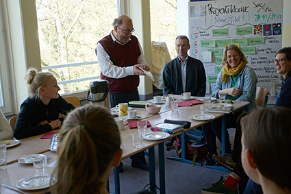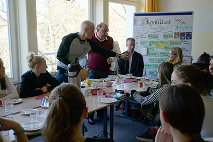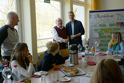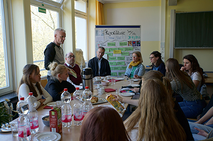 Die Mittagspause mittwochs ist die feste Zeit, in der sich die Anti-Rassismus AG trifft. Mitte April kam Herr Dittmar Lose dazu. Die AG-Teilnehmer hatten ihn eingeladen, um sich für seinen Einsatz bei der Nominierung zum Bürgerpreises der Stadt Hamburg zu bedanken. Herr Lose schilderte in der Runde, wie es dazu kam, dass er die Anti-Rassismus AG beim Bezirksamt Hamburg Mitte benannte. Ihr Filmprojekt zur Integration und gleichzeitig als Stellungnahme auch gegen den täglichen Rassismus beeindruckte ihn. Er findet, es gibt zu wenige Menschen, die sich intensiv um vorbildliches Verhalten gegenüber Rassismus bemühen.