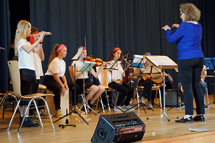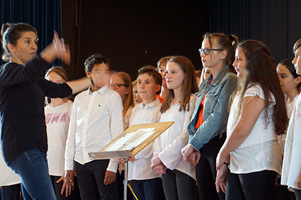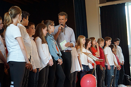 Die knapp 80 Sänger des Chores der 5. Klassen füllten zusätzlich die gesamte Bühne und setzten gleich zu Anfang allen Anwesenden zwei Ohrwürmer ins Ohr. Davon ist „99 Luftballons“ zufällig der hartnäckigste Ohrwurm unseres Schulleiters.