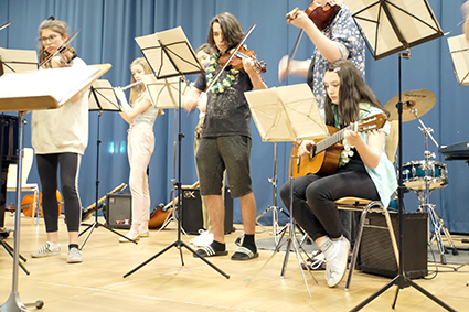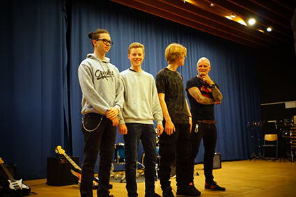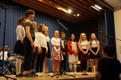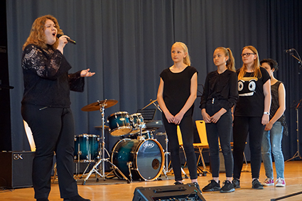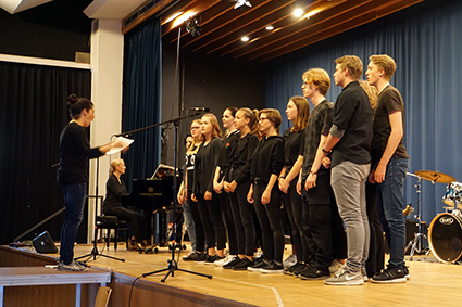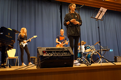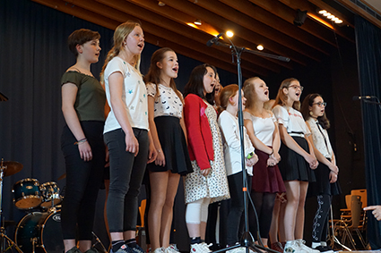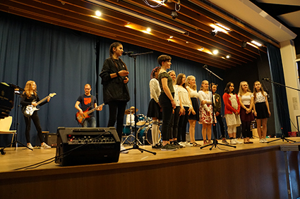 Der Oberstufenchor bettete die Zuschauer aber wieder in stimmungsvolle Klänge mit dem wundervollen Lied „Vois sur ton chemin“ aus dem Film „Die Kinder des Monsieur Mathieu“. Nachdem der Chor auch die starke Nachricht „Don’t stop me now“ verbreitet hatte, beeindruckte die Band der 7. Klassen „And an Apple“ mit drei starken Songs hintereinander. Die drei Mädels haben es zusammen mit ihrem Bandleiter John Lahann geschafft, die Zuschauer mit ihren Lieblingsliedern zum Wippen zu bringen und beim letzten Song „Twist and shout“ sogar zum Klatschen und Mitsingen (zusammen mit dem Mi-Chor). Das war ein richtiger Ohrwurm für den Nachhauseweg!