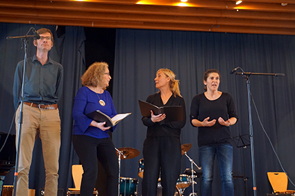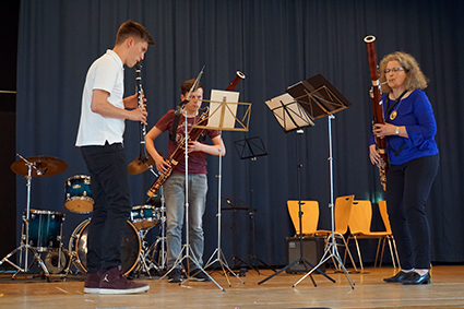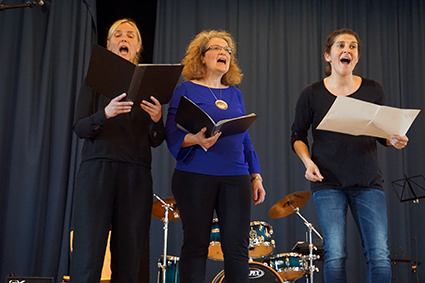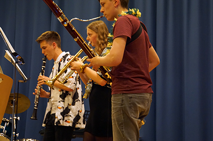 Den sogenannten „Tango aller Tangos“ spielten Mika, Henry und Frau Tirpitz eindrucksvoll auf zwei Fagotten und einer Klarinette. Danach boten die drei Musiklehrerinnen mit tatkräftiger Unterstützung von Herrn Prolingheuer a cappella einen weiteren Ohrwurm und ließen einen Calypso aus Trinidad erklingen.