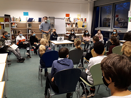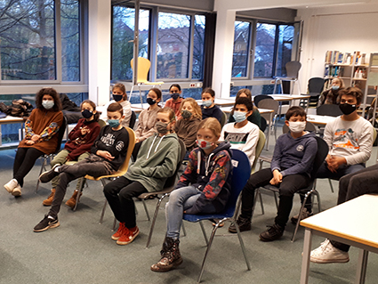 Ja, unbedingt! Anfang Dezember versammelten sich um 8:00 Uhr jeweils die drei besten Leserinnen und Leser aus den drei 6. Klassen in der Bibliothek. Sie traten gegeneinander an und kämpften um den Titel des Schulsiegers im Vorlesewettbewerb. Aus den drei Klassen saßen jeweils fünf Kinder im Publikum, um ihre Mitschülerinnen und Mitschüler zu unterstützen. Die anderen waren per Videokonferenz aus den Klassenräumen dazugeschaltet. So kam eine richtige Wettbewerbsstimmung auf.