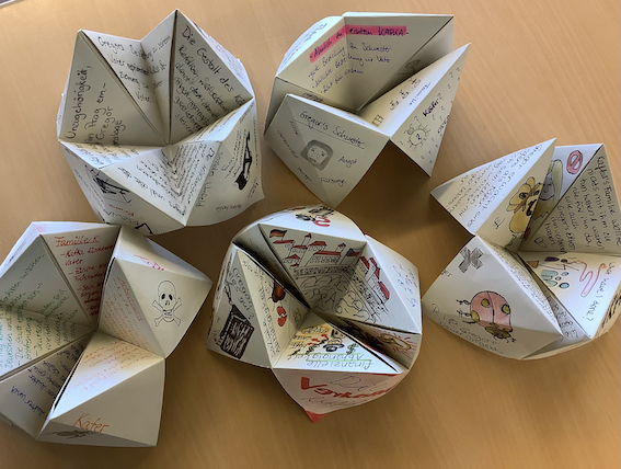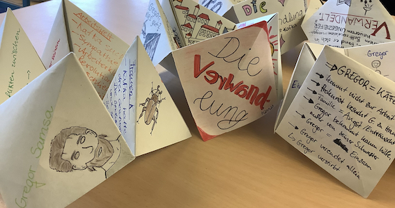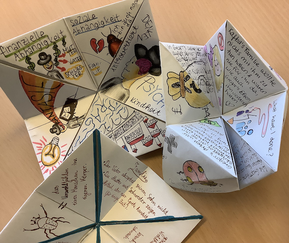 Anlässlich des 100. Todestags von Franz Kafka beschäftigte sich der Jahrgang 11 (S2) mit Kafkas Erzählung „Die Verwandlung“. Nach der Lektüre und Analyse des Textes gestalteten die Schüler:innen ein „Schnipp-Schnapp“, das auf drei Ebenen Inhalt, Bedeutung und die persönliche Lesart der Rezipienten zeigt. Es entstanden bemerkenswerte Ergebnisse!