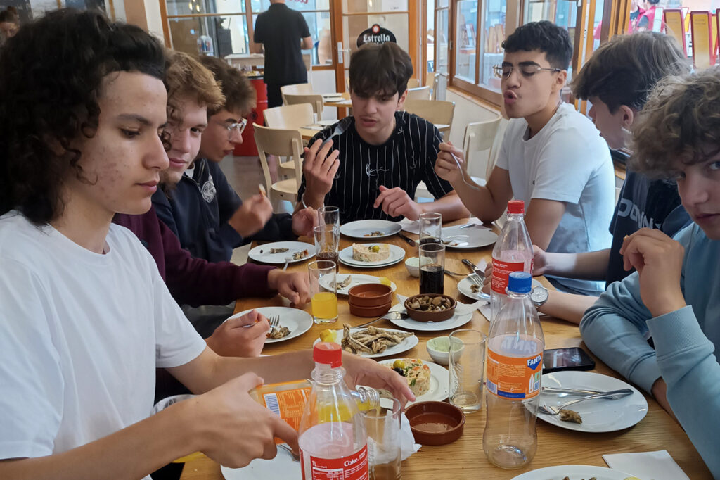 Im spanischen Supermarkt Calpesa in Bahrenfeld verschafften die Schüler:Innen sich einen Eindruck davon, welche typischen Lebensmittel man in Spanien vertreibt. In der angeschlossenen Tapasbar Tapería de Javi durften wir dann einige der bekanntestes spanischen Tapas probieren und uns davon überzeugen, wie schön es ist, gemeinsam zu essen und zu teilen. Dabei waren die Geschmäcker der Schüler:Innen ganz unterschiedlich. Während die einen sich fast ausschließlich von Brot mit Aioli Dip ernährten, entdeckten andere ihre Liebe zur ensaladilla rusa oder zu den muslitos del mar. Zur großen Überraschung des Restaurantbesitzers mochten einige unserer Schüler:innen die boquerones fritos sehr gerne, da man auch in der Türkei kleine frittierte Fische isst und ihnen diese Tapa daher nicht fremd war.