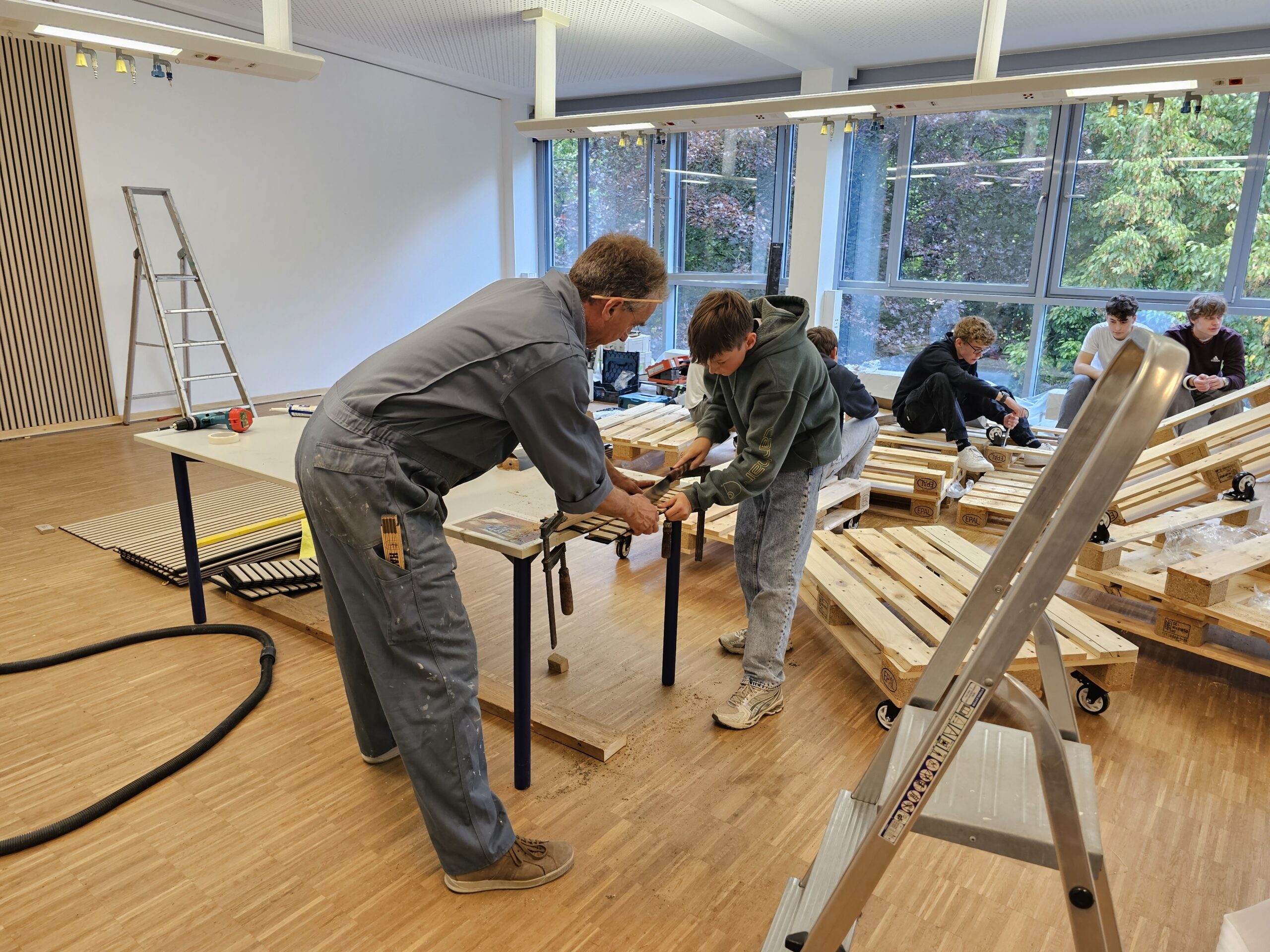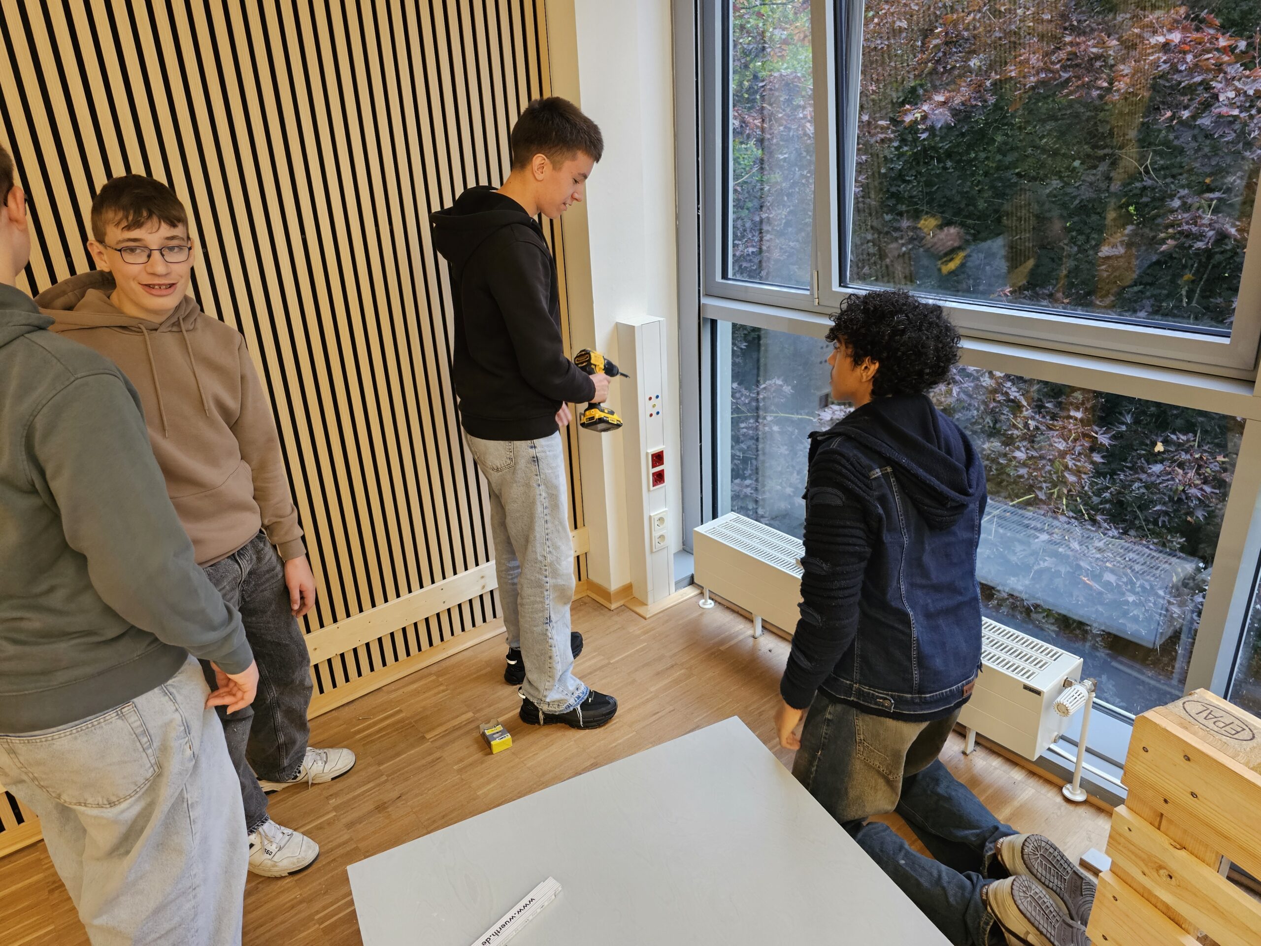 Ein ehemaliger Naturwissenschaftsraum wird zum Zukunftsprojekt: Schüler*Innen des 9. Jahrgangs haben am Gymnasium Finkenwerder begonnen, den früheren Phänomenta-Raum in ein modernes und offenes Raumkonzept für zeitgemäßes Lernen zu verwandeln. Wo früher Experimente durchgeführt wurden, wird nun gesägt, gestrichen und gebaut – und das mit viel Eigeninitiative und Teamgeist.Wände erhalten frische Farben, Holzpaneele sorgen für eine warme Atmosphäre, und aus Paletten entstehen flexible Sitzmöbel und mobile Arbeitsinseln.Das Ziel: einen Raum zu schaffen, in dem Lernen künftig selbstbestimmter, kreativer und gemeinschaftlicher gelingt. Statt Klassenraumatmosphäre entsteht ein Raum zum Denken, Ausprobieren und Gestalten – mit Zonen für Rückzug, Austausch und digitales Arbeiten. Darüber hinaus soll das Selbstlernzentrum auch ein Ort der Begegnung werden – für Lesungen, Präsentationen oder schulische Veranstaltungen wie Elternforen und Ausstellungen.Die Schüler*Innen bringen dabei nicht nur handwerkliches Geschick ein, sondern auch Teamgeist und Begeisterung für dieses Projekt. Am Ende steht kein fertiges Produkt, sondern ein Raum im Wandel: ein lebendiges Experiment, das zeigt, wie Lernen an einer modernen Schule neu gedacht werden kann.