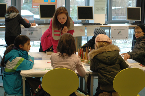 Staunen, stöbern, suchen – zum diesjährigen Tag der offenen Tür waren auch die Pforten der Schulbibliothek Finkenwerder für interessierte GrundschülerInnen und Eltern geöffnet. Für Fragen rund um den vielfältigen Bücherbestand und die Nutzungsmöglichkeiten der Bibliothek – vom gemütlichen Rückzugsraum in den Pausen, zur Ausleihe bis hin zum Unterricht der ganz anderen Art – standen Frau Ditzenbach und Frau Salomon zur Verfügung. Zahlreiche BesucherInnen besichtigten an diesem Tag die Räumlichkeiten und beteiligten sich aktiv an den abwechslungsreichen Mitmach-Angeboten. Für Entspannung sorgte die kuschelige Vorleseecke: auf Kissen und Decken liegend, konnten die BesucherInnen den Geschichten der VorleserInnen lauschen. Künstlerisch wirken konnten SchülerInnen in der Malecke – mit Wachs- oder Buntstiften wurden Geschichten oder Szenen aus den Lieblingsbüchern gezeichnet. Auch für die Eltern hatte die Schulbibliothek eine tolle Idee: Frau Jasper von der Bücherinsel Finkenwerder bot neue Bücher rund um die Themen Naturwissenschaft und Weltgeschichte, aber auch Romane an. Die Medien konnten von den Eltern erworben und der Bibliothek als Geschenk überreicht werden. Als Dankeschön wurde in den gespendeten Büchern ein Stempel mit Namen des Schenkenden verewigt.